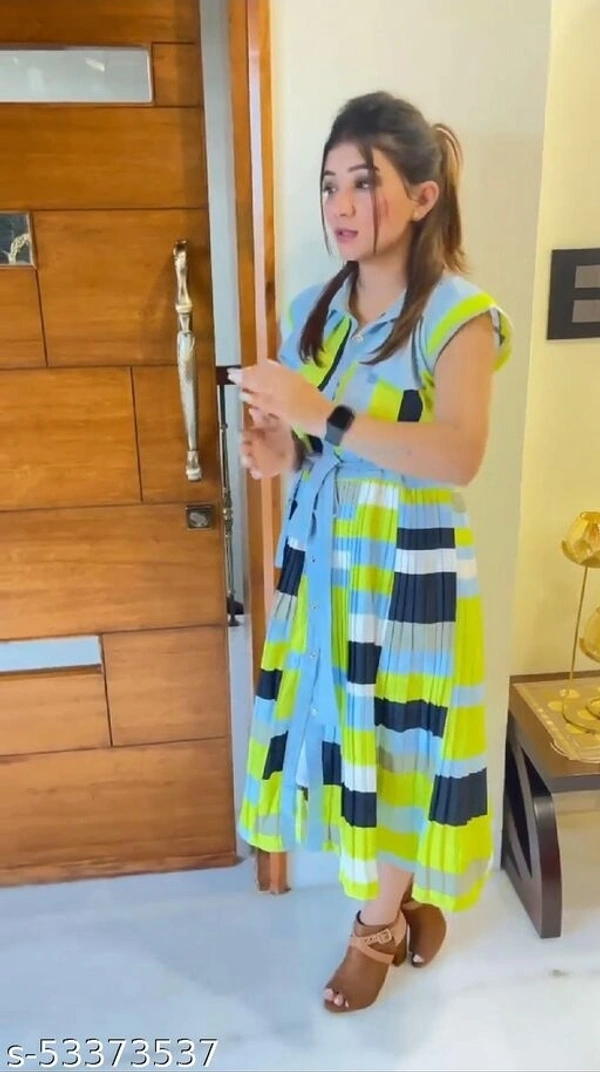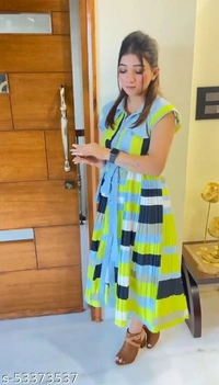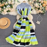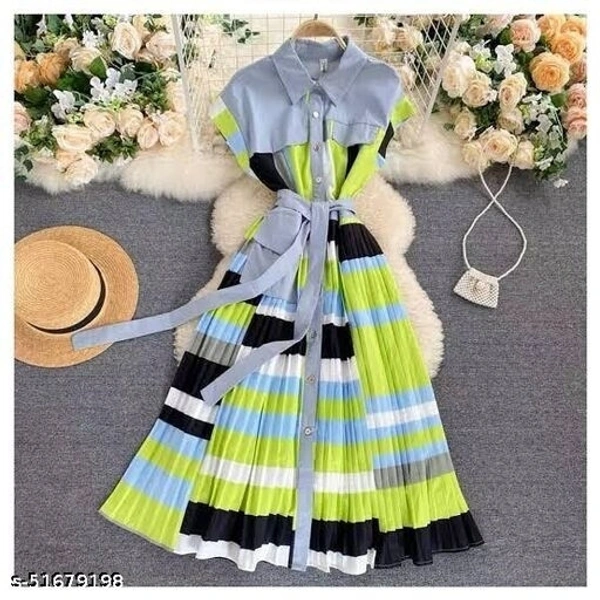 New Design Irregular Color Matching Tie Wrap Waist Pleated Long Dress